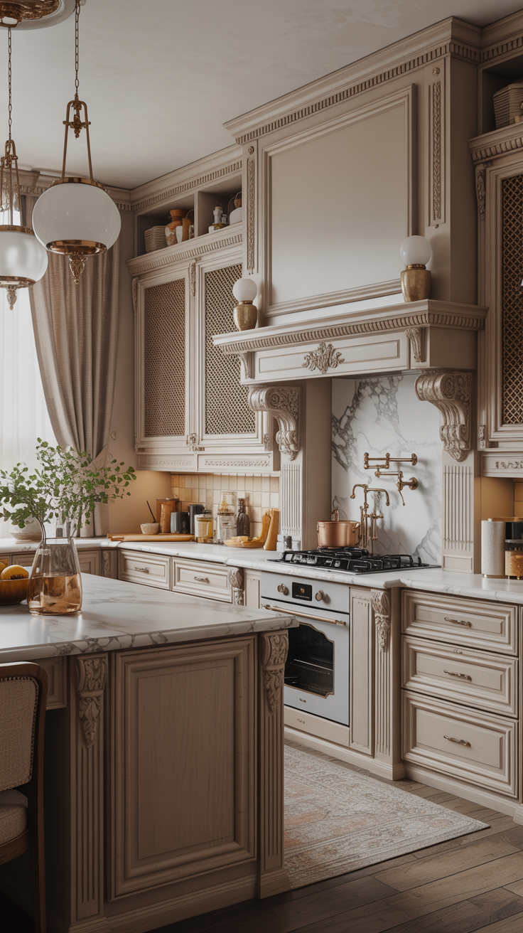 This kitchen showcases some of these architectural elements: hood frame, columns on the table, furniture skirting, and more.